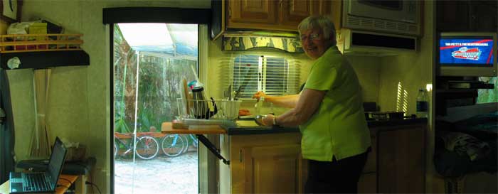 Cloudy and 20% chance of light rain. After it warmed up we hopped on our bikes and headed for the trail. Peggy said, look at all those black clouds we better go back. I almost agreed. We turned around but I said let's go see the other campground a mile down a powdered limestone road. Just as we got there it started to rain, as we turned back it rained harder. Not only were we soaked but our bikes sprayed white limestone all over us. Peggy has not happy. Later in the day I took a ride by myself to a Winn-Dixie about 4 mi away and bought some food to cheer her up. Maybe it will be sunny tomorrow.