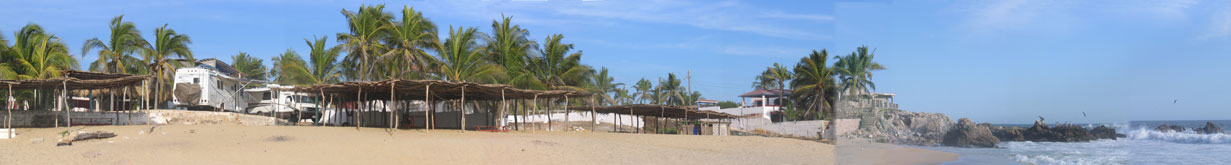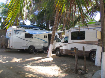 The last time we were here we stayed at a campground that was small but close to the beach unlike the bigger park, Fernando's, that is across the road in a hot field a good walk from the beach. When we got to the camp we found out that they had sold it and were erecting a small hotel in it's place, again we can't camp where we would have liked. However after asking around we found another small campground right on the beach called La Habana. Things were tight but we wedged our two RV's in. A nice couple from Quebec is staying for the whole season and didn't mind that we were right on top of them. They have nice showers here and luckily I parked close enough to their toilets that with my pumped sewage system I could pump directly into the nearby toilet since there are no camper dump facilities. The only drawback to this camp is that we are next to a beach disco that blasts its American music till all hours of the night. So I'm not sure how long we will stay.