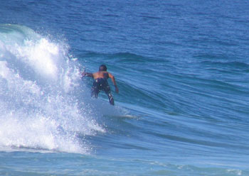 1/21/07 - We left La Habana on Zipolite Beach on Sunday morning for a short drive to Puerto Escondido. The town is popular for a hippie and surfer subculture which dates from the early 70's. Some look like they have never left since then. There are several campgrounds that motorhomes can fit into but we heard that they we both crummy. We asked a car full of surfers if there was any place that we could just camp on Zicatela Beach, they said; "sure follow us". We discovered a big sandy parking lot about a mile down the beach from the city. On a Sunday, the city beaches were packed with Mexicans enjoying a nice family day at the beach. Two more huge motor homes showed up to share our find. On the second day a guy walks over from a house across the street and says that they own the property and we need to give them 50 pesos ($5) for a camp fee. With much reluctance I agree if they will fill my sun shower.