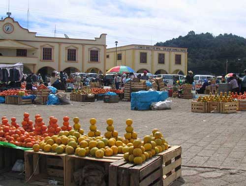 | We stayed a few more days in las Casas, took a nice hike (picture-on right) and went shopping in their big outdoor market. We finally got tired of the 35o mornings and 65o high temperatures, Peggy was looking for the heat and beaches of the coast. We drove down from the 7000' town over a 8000' pass down to about 1500' at Tehuantepec, it's not a long drive but it took us 8 hours. | ![]() |