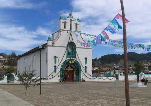 | So when we go to the next town of Zinacantan I'm afraid to even take the camera out. They were in full celebration of the same holiday, dancing, bands, bike race, basketball game, wild costumed characters running around with fireworks going off on their costumes. Three men dressed as Jaguars climbing a tree while the people below throw dead squirrels at them. Not to mention that all these Indian people wear beautiful dark blue and Turquoise embroidered costumes with iridescent threads that looked like upholstery material to me. This was a tour to remember, it was unlike any part of Mexico that I have ever seen. | ![]() |