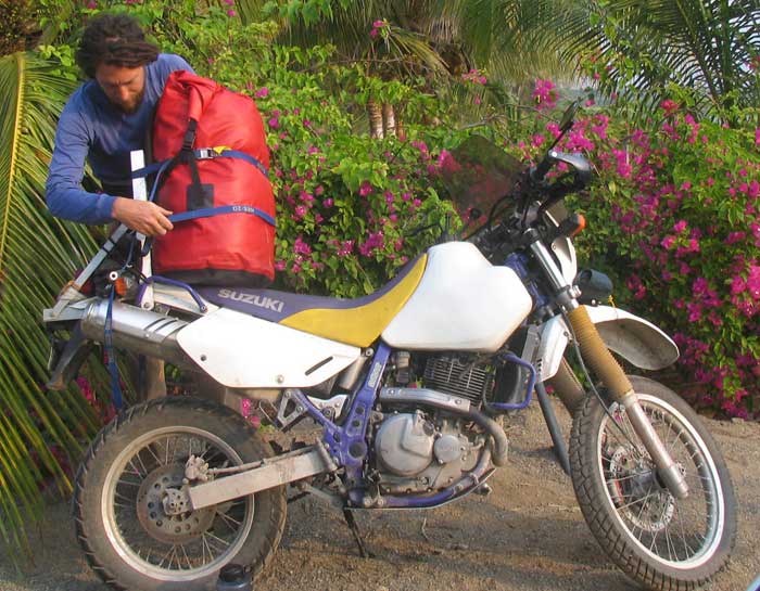 He is fine, looks like a wild eyed Mexican on his combination road/dirt bike. His only spill was riding the trails in Mexico's Grand Canyon. He seems to have gotten used to the Mexican traffic and the Topes (Speed