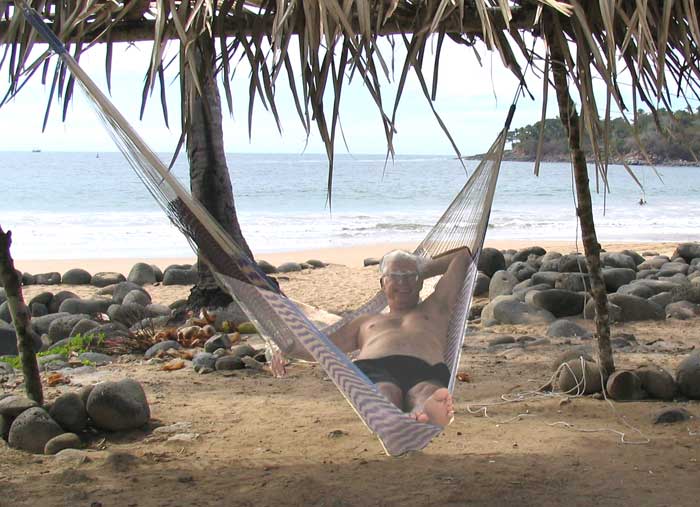 We discovered Chacala on last year's trip and found that we could camp next to a small beach house that a local Mexican has been squatting in for the past 30 years. He built two other small homes for his children and grand children along with banos (toilets) and regaderas (showers) for tourists. We got a campsite on the water right next to where we had camped last year. The cost is only $25 per week but it has no hookups. They say it rained here yesterday but it was only partly cloudy with the same cooler temperatures. I like this bay since it faces due West and you get great Mexican sunsets.