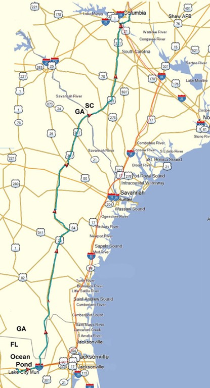 Here is our planned route North to Ocean Pond and then to Stephen Foster Sate Park in the Okefenokee in Georgia.