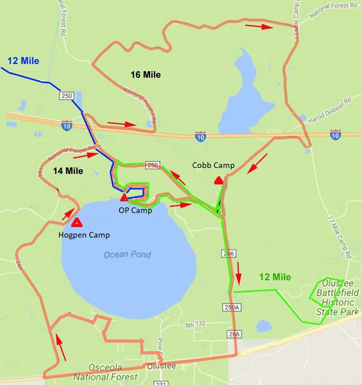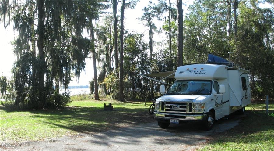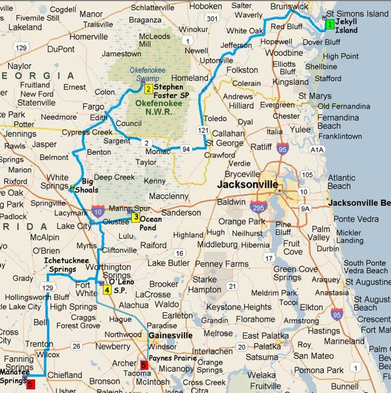 After the holiday weekend we should be able to get a site in 3 Ocean Pond campground in the Osceola National Forest. Last year the place was packed over the holiday, but most campers leave on Sunday. We then plan to head a little further south to some Florida State Parks, 4 O’Leno, Ichetucknee Springs, and 5 Payne’s Prairie, staying a few days and doing some canoeing & biking
