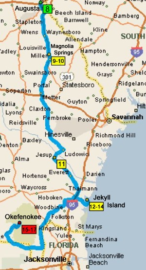 We then will head to the coast of GA, trying to avoid the Interstate highways. We picked Jekyll Island, GA as a good place to start our trip since the weather in mid-November is usually warm and they have really nice bike trails that circle the island.