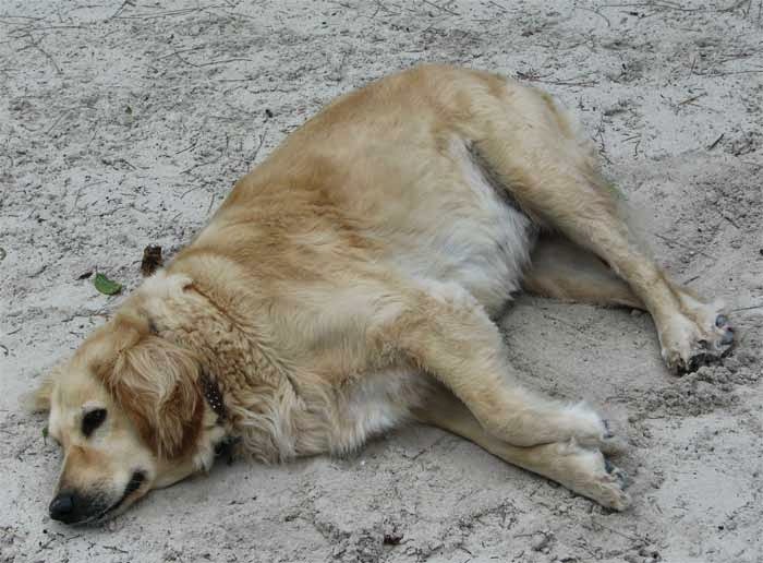 Goldie eats so much this is how she normally looks, laying down on the job. Sigrid looks after her.