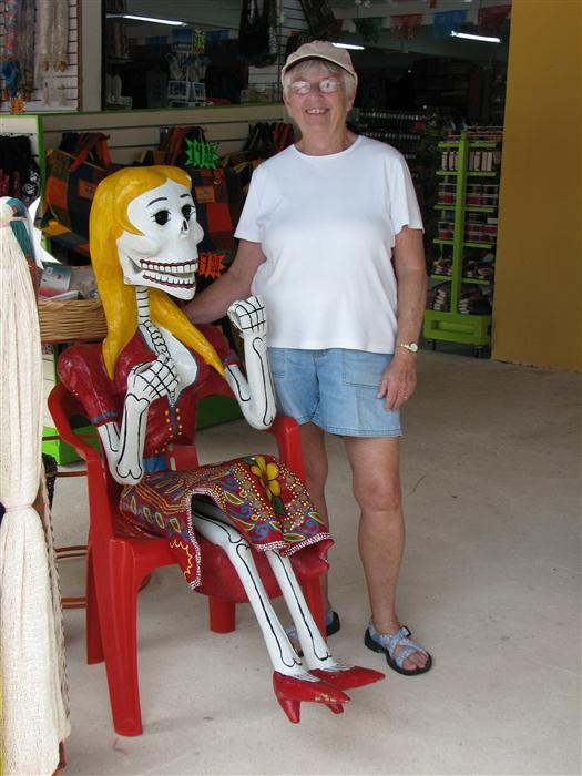 Peggy found a skinny friend in one of the stores. It was amazing to see all the stores and trinket stands come to life when the boat people are in town. From the cruise schedule it looks like the locals only have to work 3 or 4 days a week. Yesterday hardly a soul was around. This morning the place was jumping, with everyone getting ready to sell their wares.