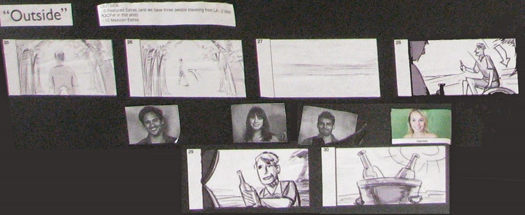 Here are the story boards and actors for this year. They are shooting 3 commercials at this location and one back at last year’s location. Click any picture for a bigger view.