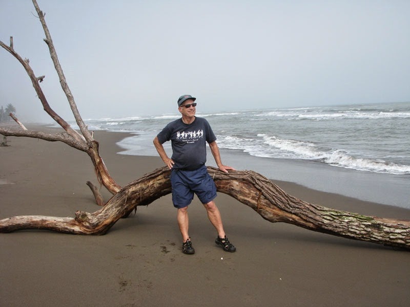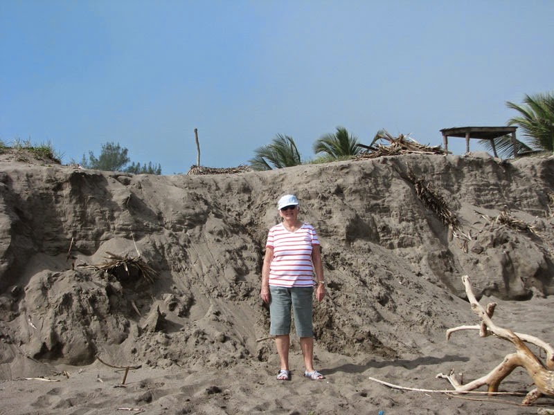 All the hotels and campgrounds along the beach have lost about 5’-10’ of land, which included their steps, palapas and palm trees. There are lots of trees down all along the beach. We took a 2 mile walk on the nice flat dark brown beach.