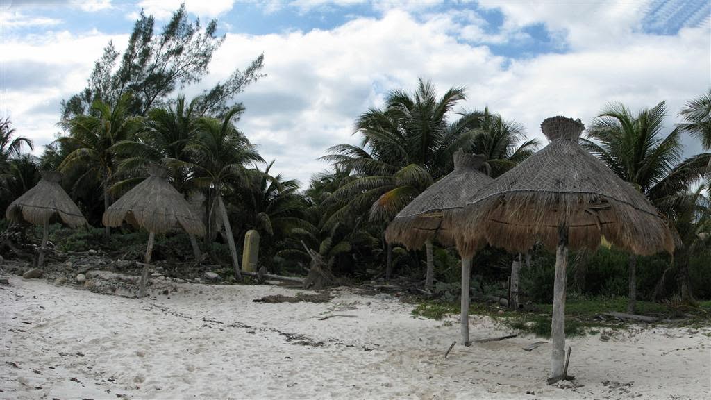 Both ends of the beach have hotels that closed after a hurricane and never reopened. We like to hang out under these abandoned palapas.