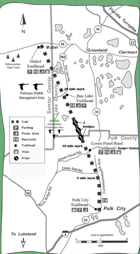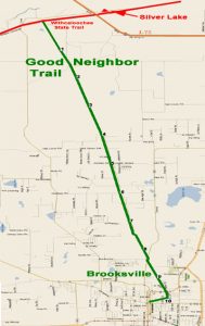 You access the rail trail at milepost 9, so you can make a nice 20 mile round trip heading south. If you head north you have the option to take the new Good Neighbor Trail which opened last year and goes to Brooksville. This makes a 25 mile round trip, or you can keep heading north up to Floral City another 25 mile round trip. Of course in all three directions just turn around whenever you want. The trail has a gentle slope in deep woods in all directions since it follows an old abandoned railroad.